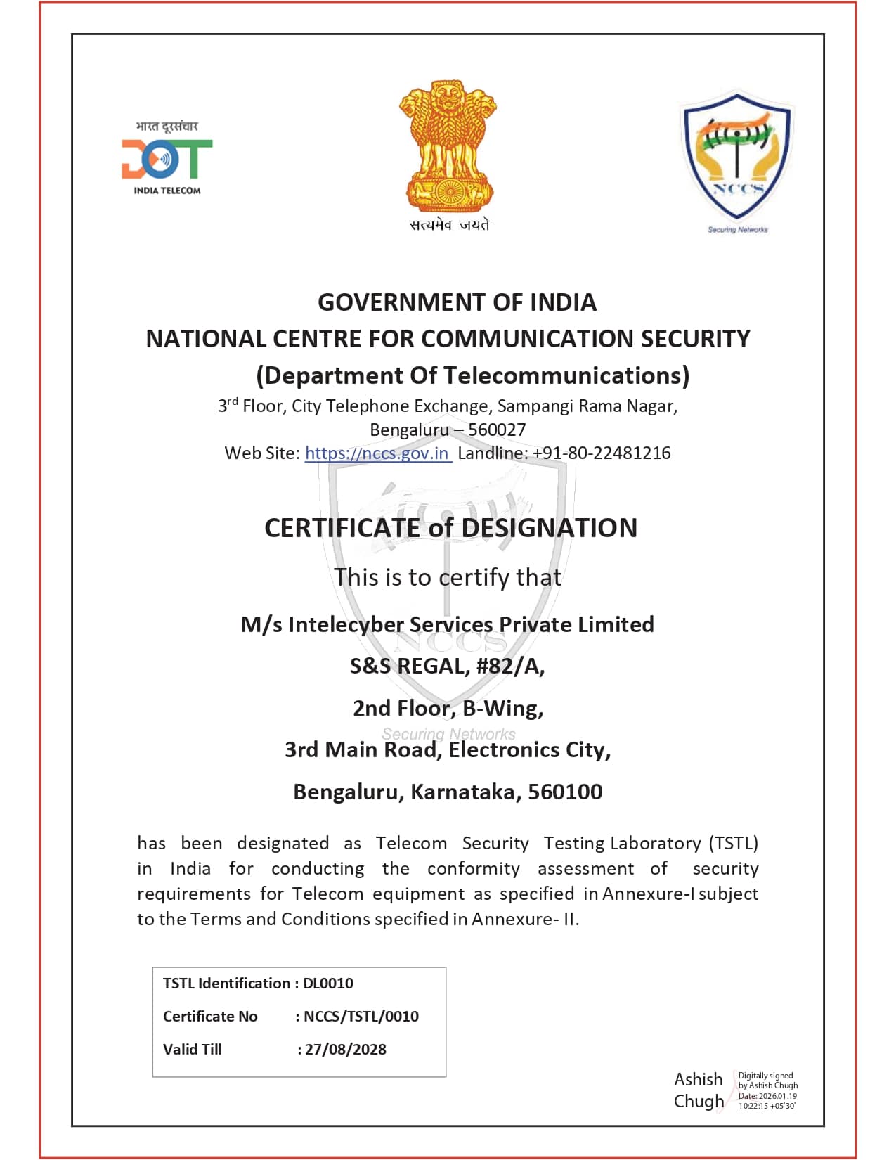 Bengaluru, India | August 28, 2025 — InTeleCyber, a leading cybersecurity testing and compliance services provider, announced that it has been officially designated as a Telecom Security Testing Laboratory (TSTL) by the National Centre for Communication Security (NCCS) under the Department of Telecommunications (DoT), Government of India.
